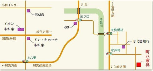 ■国道8号線を小松方面へ向かって走り、 旧松任乾東信号を左折⇒国道157号線を白峰方面へ走り、 水戸町信号で左折⇒新町の信号を右折し、そのまま道なりに500mのところにあります。